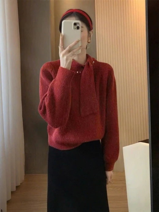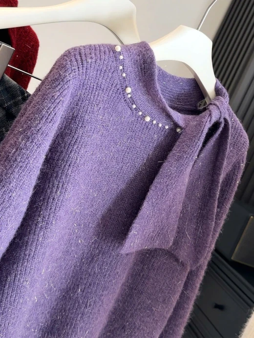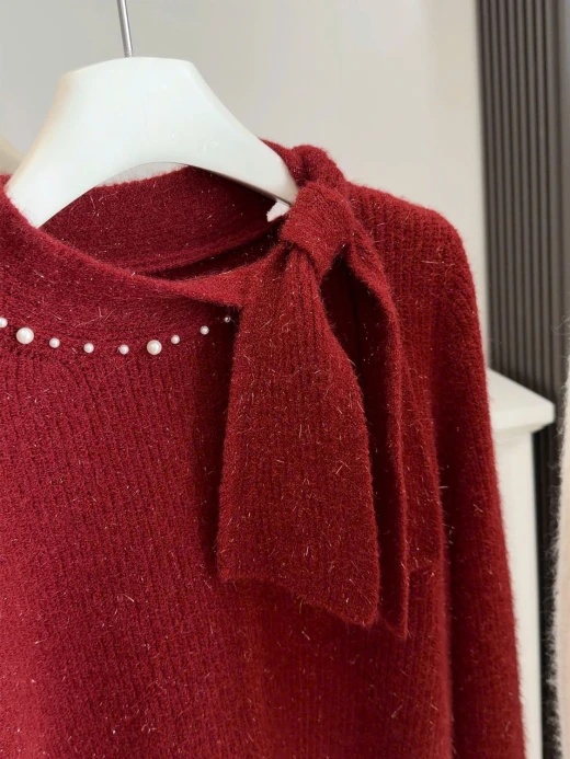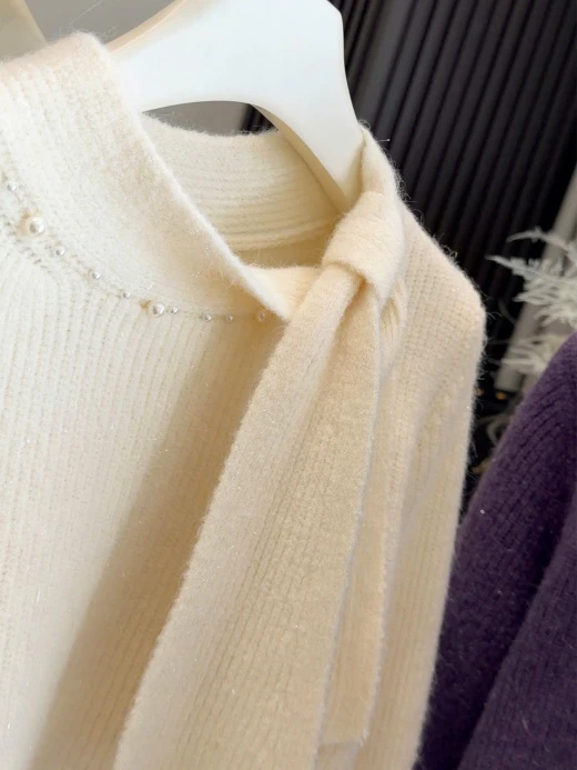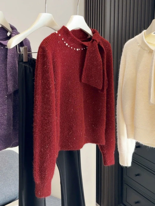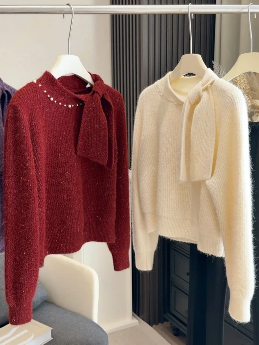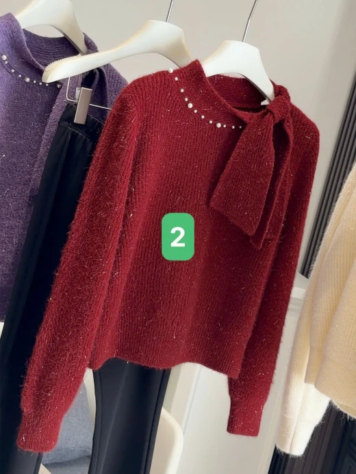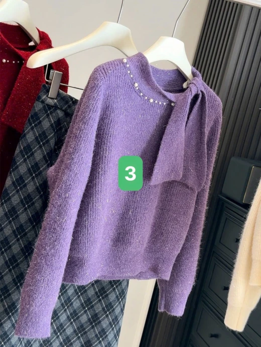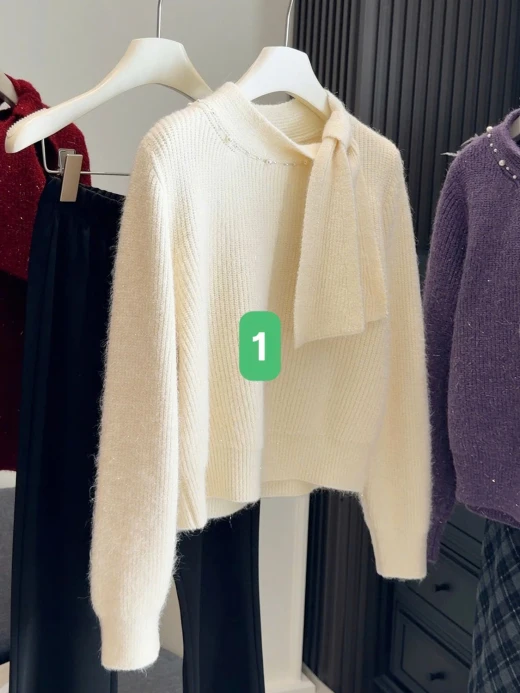 #3112b47 ÁO LEN PHỐI VẠT CỔ NƠ ANNA Thiết kế cổ thắt nơ lệch vạt, điểm ngọc trai nhẹ sang xịn. Chất len mềm mịn có ánh sợi nhẹ, mặc ấm mà vẫn thanh lịch 3 màu đánh số ✅freesz 40-60kg 🌸 giá 211k 🐬 chốt 31/12