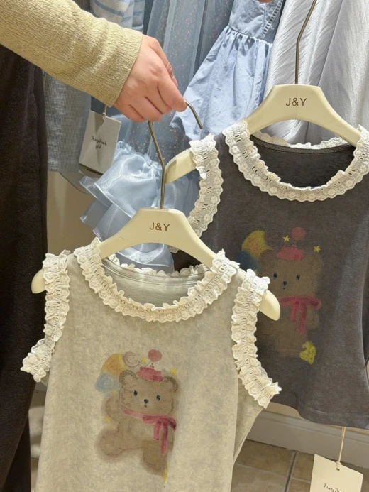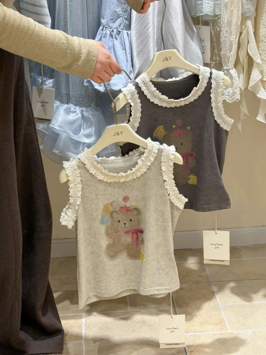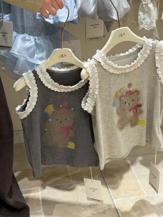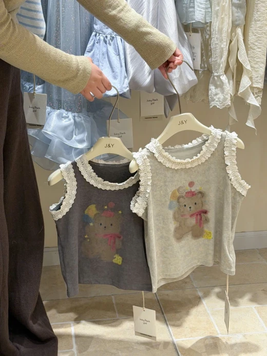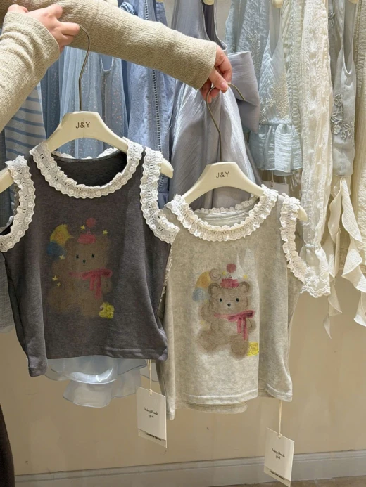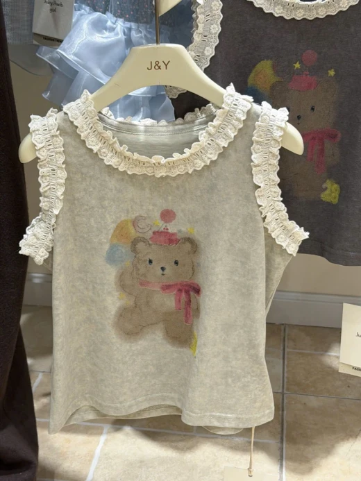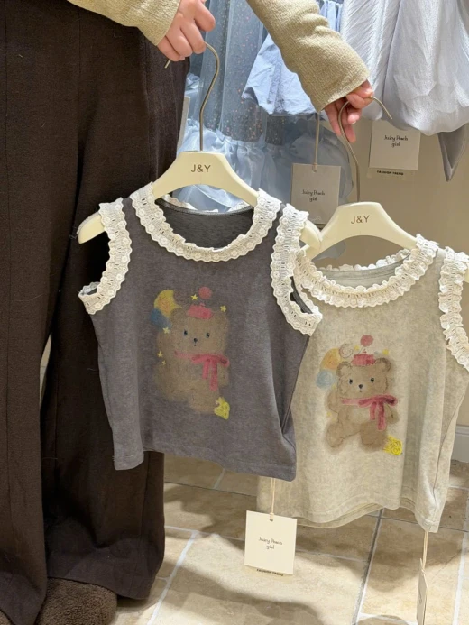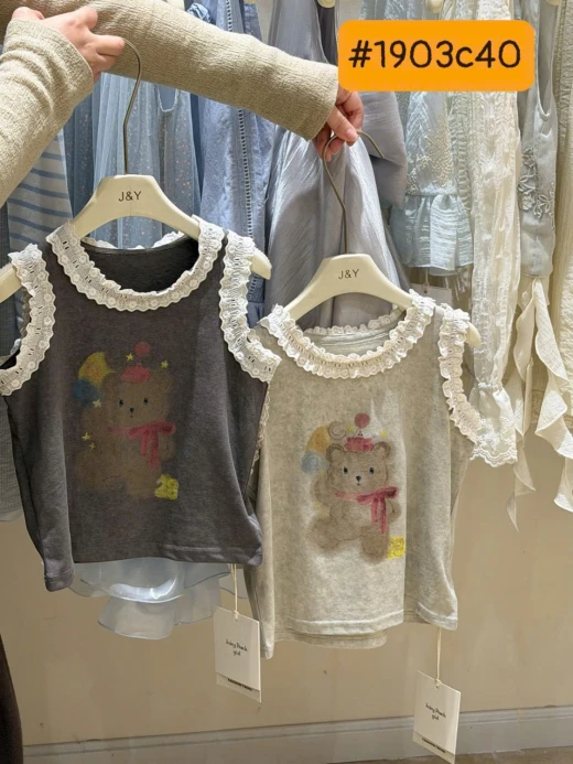 #1903c40 ÁO SÁT NÁCH HÌNH GẤU VIỀN BÈO Thiết kế sát nách thoáng mát, điểm nhấn viền bèo mềm mại 2 màu: be, xám ✅sz 90-150 🌸 giá 139k 🐬 chốt 19/3