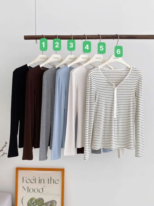 #1310b41 ÁO THUN DÀI TAY THU ĐÔNG Chất mềm mịn, co giãn nhẹ, giữ ấm vừa phải cho ngày se lạnh. Thiết kế cổ chữ V có khuy, tạo điểm nhấn tinh tế, dễ mặc dễ phối. Bảng màu đa dạng đáp ứng mọi phong cách. Mix với quần jean, quần suông hay chân váy đều hợp – đi học, đi làm, đi chơi đều đẹp. 6 màu đánh số ✅Sz: M, L M 40-55KG L 55-70KG 🌸 giá 163k 🐬 chốt 1310