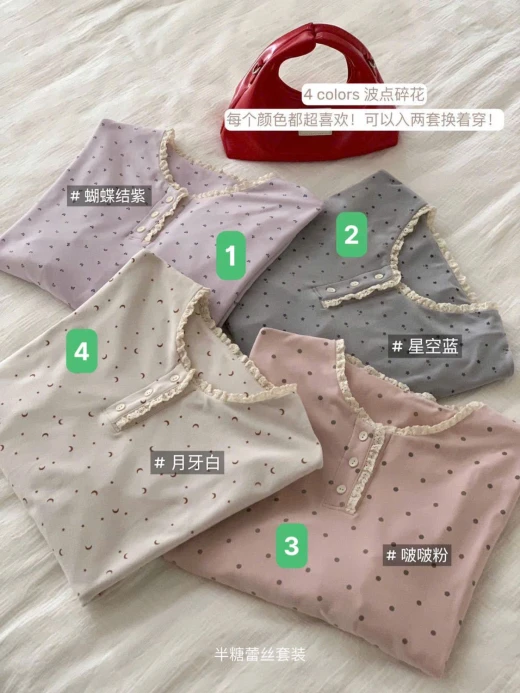 #0911b56 BỘ COTTON MẶC NHÀ CHẤM BI VIỀN REN ✔4 màu : đánh số ✔Free size <70kg 🌸 giá 253k 🐬 chốt 9/11