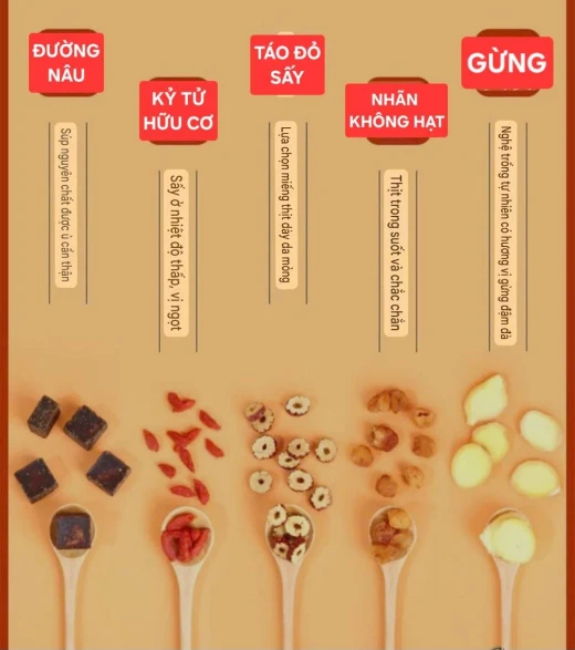 #2011b63 🧧🧧Tết e gây nghi.ên thành công trà này cho khách 😂 uống hết khách lại mua thêm nên e gom đợt nữaa😊 Uống vừa ngon vừa ấm bụng, ấm người vừa dưỡng nhan. Pha ấm trà ra sân lá chill chill 😘 TRÀ GỪNG TÁO ĐỎ ĐƯỜNG NÂU thơm ngon, #giữ_ấm cơ thể, #giảm_đau_bụng, #dưỡng_nhan... ‼️ ‼️ COMBO 2 HỘP TRÀ GỪNG TÁO ĐỎ ĐƯỜNG NÂU #1xxkkk________1xxkk /combo 2 hộp 👉mỗi hộp 10 gói *15g/1 gói 👉Trà thanh nhiệt, giải độc gan, tăng lượng protein, huyết thanh trong cơ thể. _ Bên cạnh đó trà gừng táo đỏ còn giúp da hồng hào, khoẻ khoắn. _ Giữ ấm cơ thể khi nhiệt độ thay đổi đột ngột hoặc khi thời tiết vào đông. _ Làm dịu cổ họng, giảm ho, ngứa cổ. _ Hỗ trợ cho người bị thiếu máu. _ Đối với Chị em phụ nữ trà giúp làm ấm tử cung, điều hoà cơ thể giảm đau bụng kinh 👉Dùng uống hàng ngày rất tốt 👉Vị gừng hơi cay nhẹ không quá nồng, kết hợp với vị ngọt của đường nâu, long nhãn, táo đỏ tạo nên tổng thể một ly nước cực kỳ hợp với nhau luôn, vị ngọt thanh rất dễ uống. (bao bì cũ mới thay đổi tùy đợt sxuat ) =========== chốt 20/11 giá 72k/1 set 2 h