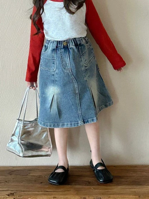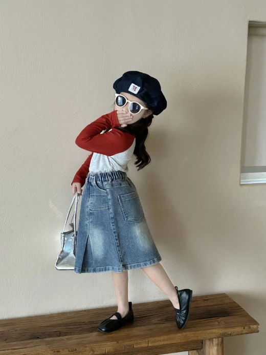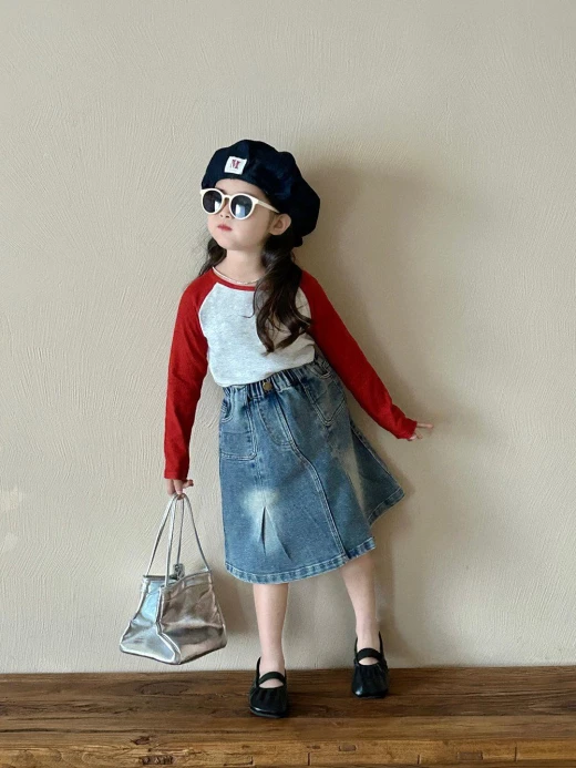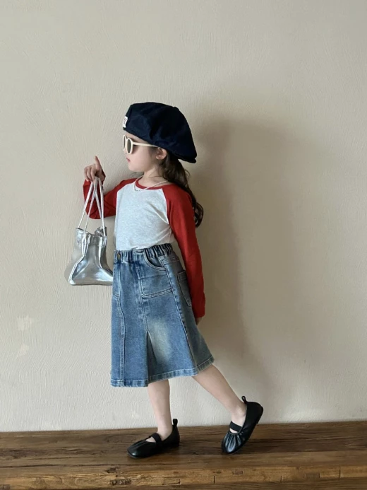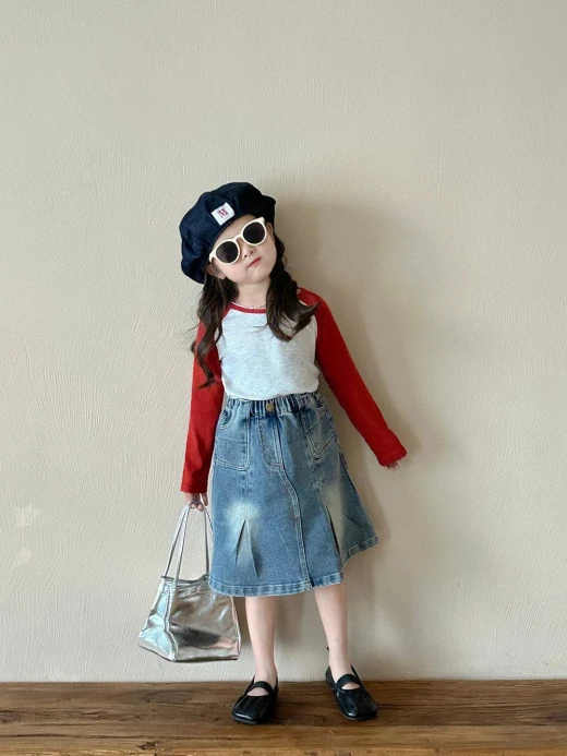 #0901a25 ? Set áo thun tay phối màu mix váy jean ✅ sz: 90-140 giá: áo 110k, váy 166k chốt 09.01